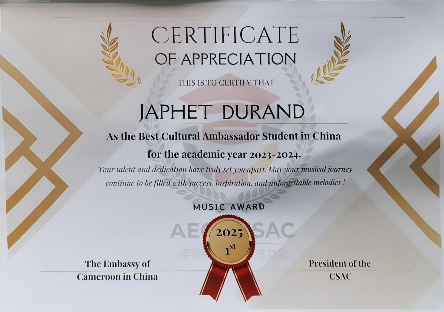 Japhet’s dedication and hard work have attracted significant attention and praise from the Cameroonian Students Union in China. After a rigorous selection and evaluation process, he stood out among numerous Cameroonian students and was awarded the title of the Best Cultural Ambassador. This accolade not only affirms his personal accomplishments but also provides him with a broader platform and more opportunities to play a greater role in China-Cameroon cultural exchanges.